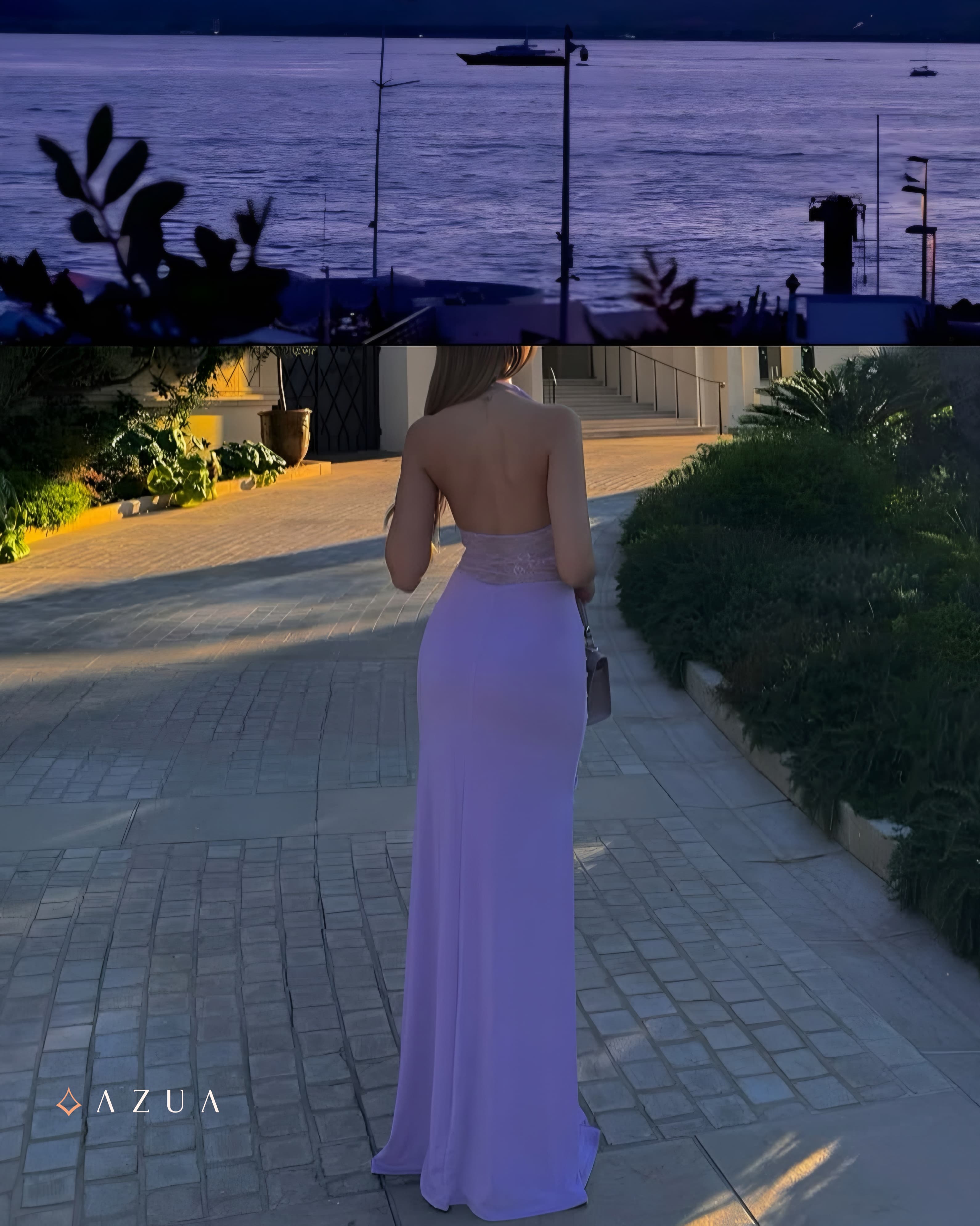 Designed with a halter neckline and a softly gathered bust to enhance your shape, this piece is defined by a delicate lace insert at the waist that adds both texture and allure. The gathered skirt drapes gracefully from the waist, creating movement and fluidity with every step. Finished with a button and zipper closure and partially lined for comfort, it’s the perfect choice for moonlit events, long dinners, and unforgettable entrances.