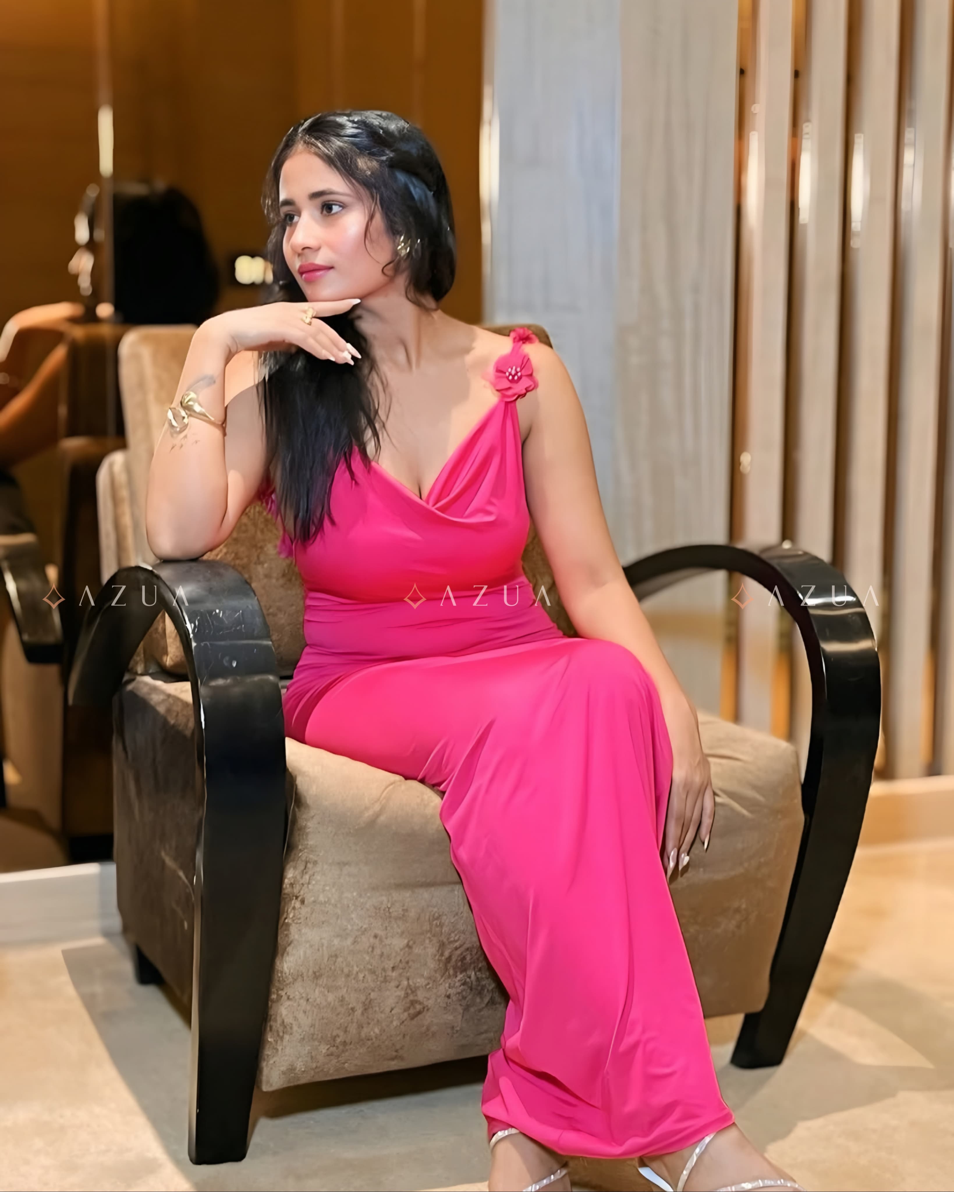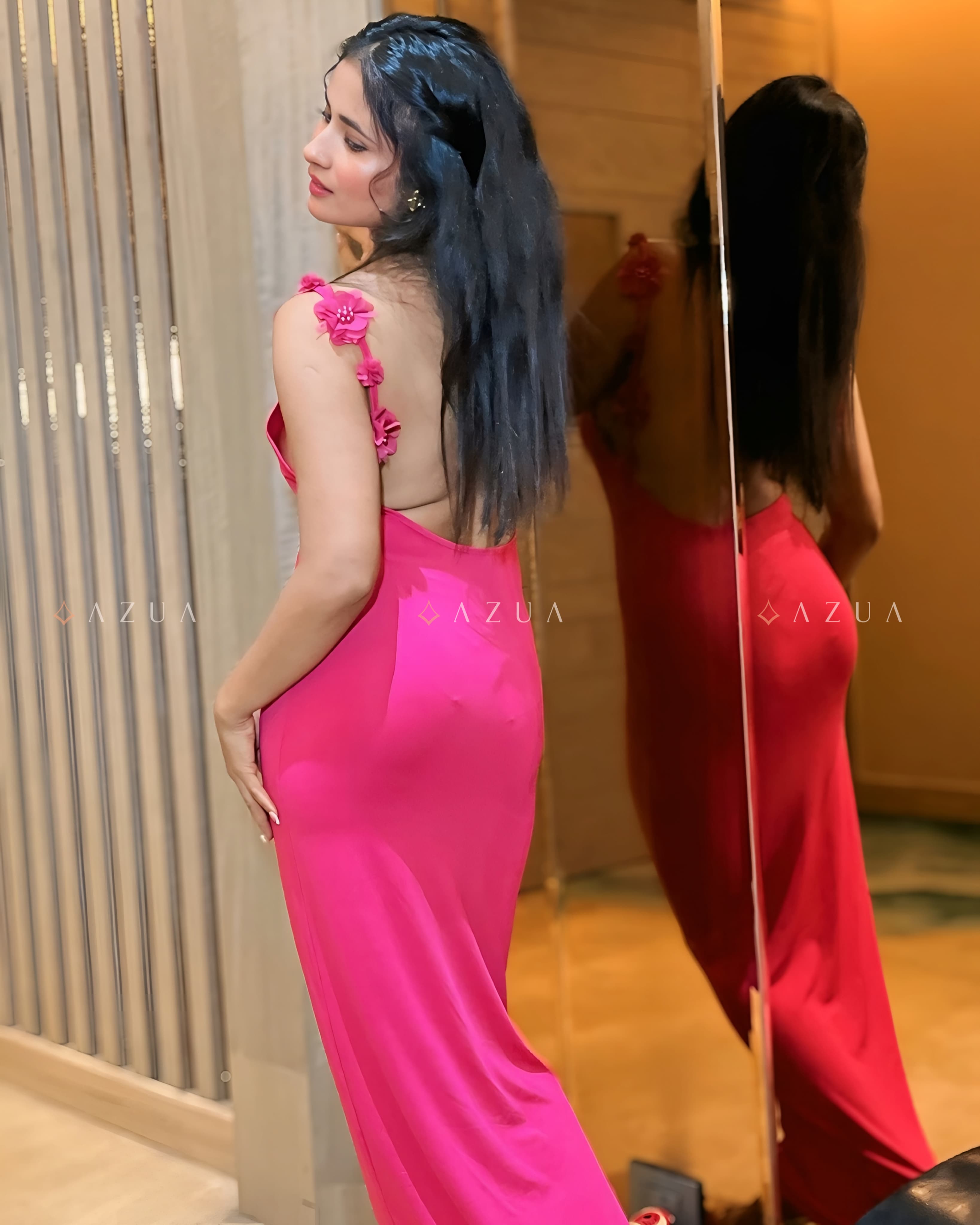 She’s delicate yet daring, simple yet striking — the Alexandra Dress is the perfect choice for those who love bold colour with beautiful detail. Crafted in vibrant fuchsia, this floor-length silhouette features a flattering cowl neckline and a subtle hourglass fit that enhances every curve. The show-stealing element? Exquisite 3D floral accents adorning the straps, adding a touch of romance and texture. A gently dipped backline completes the look with timeless elegance.