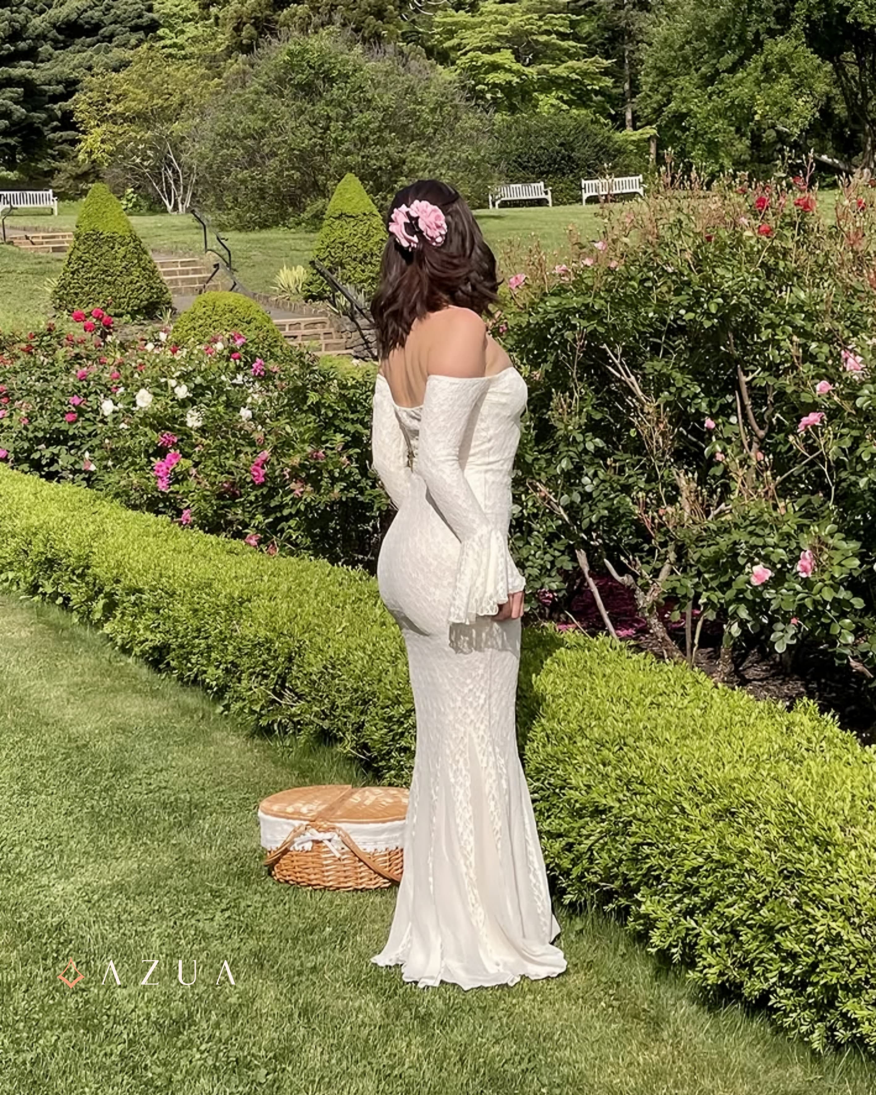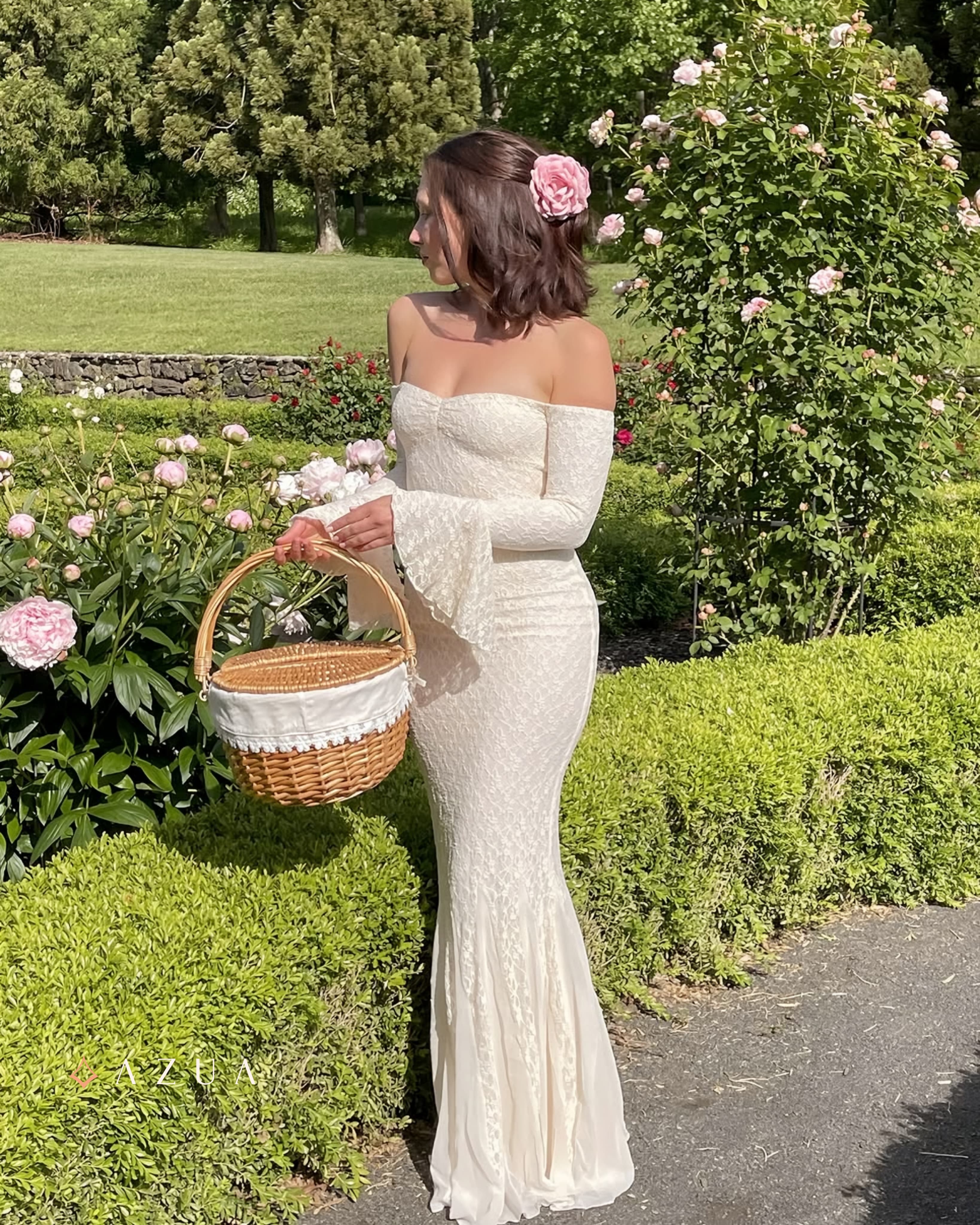 Romantic and effortlessly elegant, the Ruffle Lace Maxi Dress is crafted from premium stretch lace with a soft, sheer jersey lining that beautifully contours your shape. Designed with an off-shoulder sweetheart neckline and long fitted sleeves finished with delicate ruffled cuffs, it embodies timeless femininity. The graceful fishtail silhouette and contrasting godet pleats create captivating movement with every step — making it a perfect choice from sunlit occasions to evening affairs.