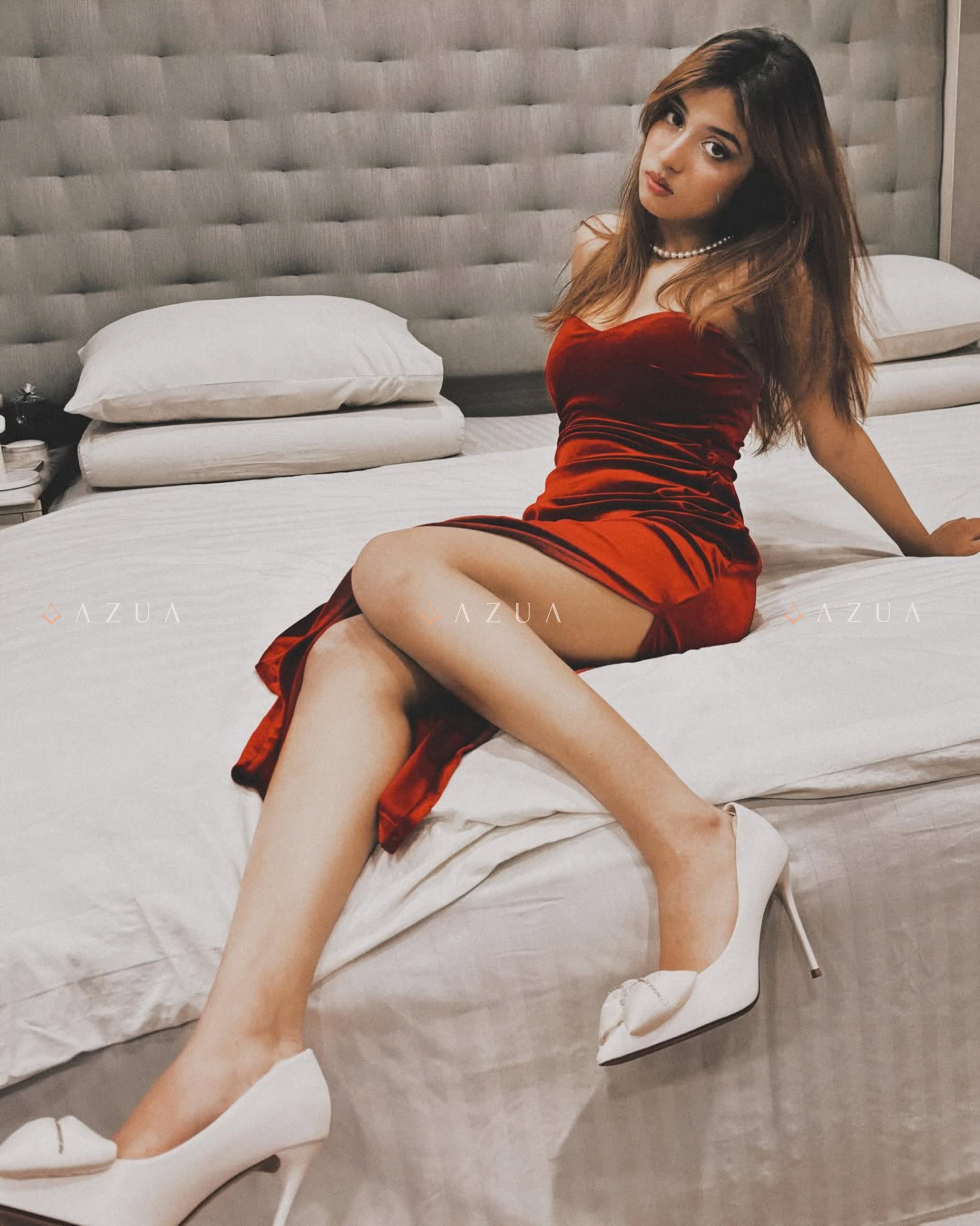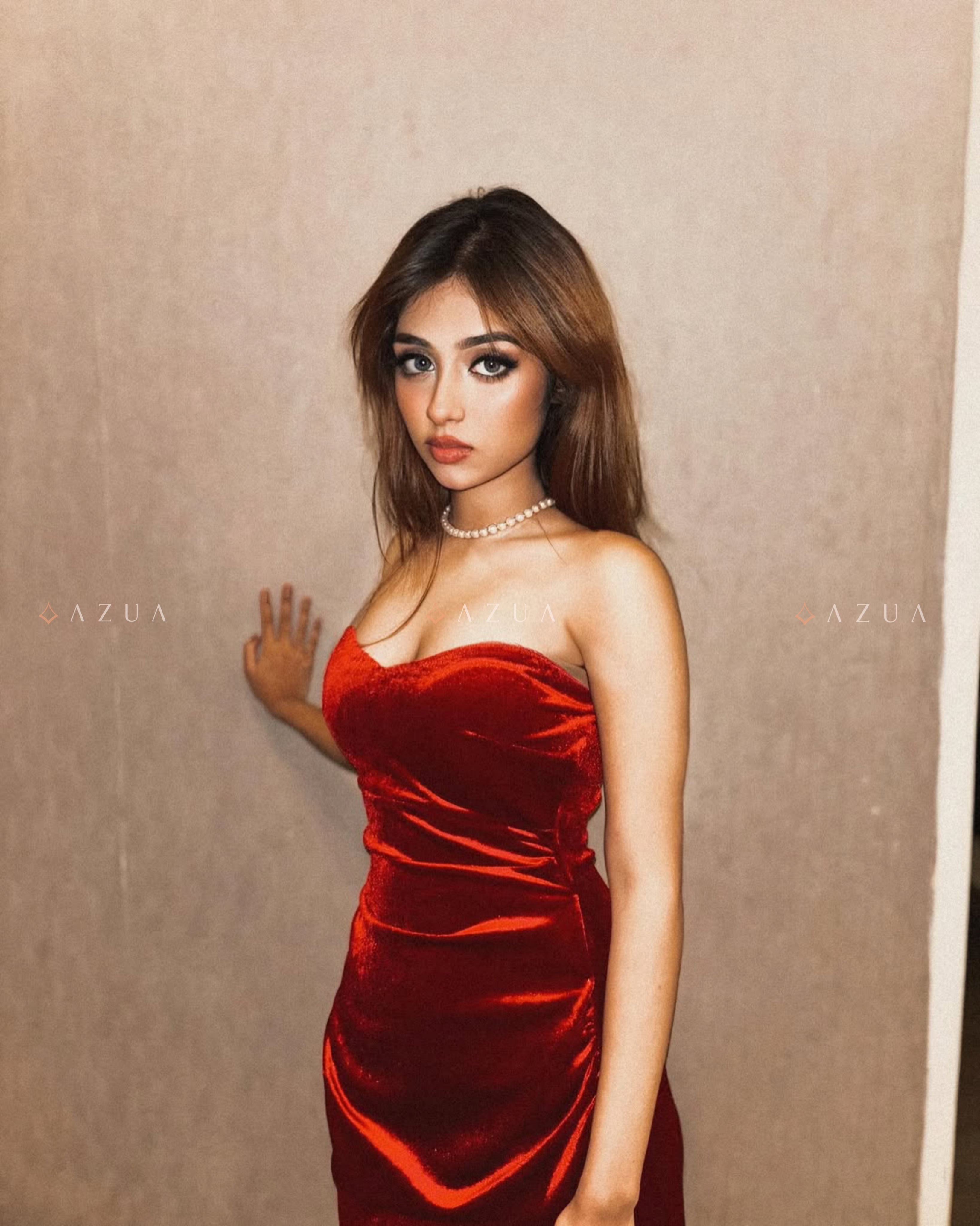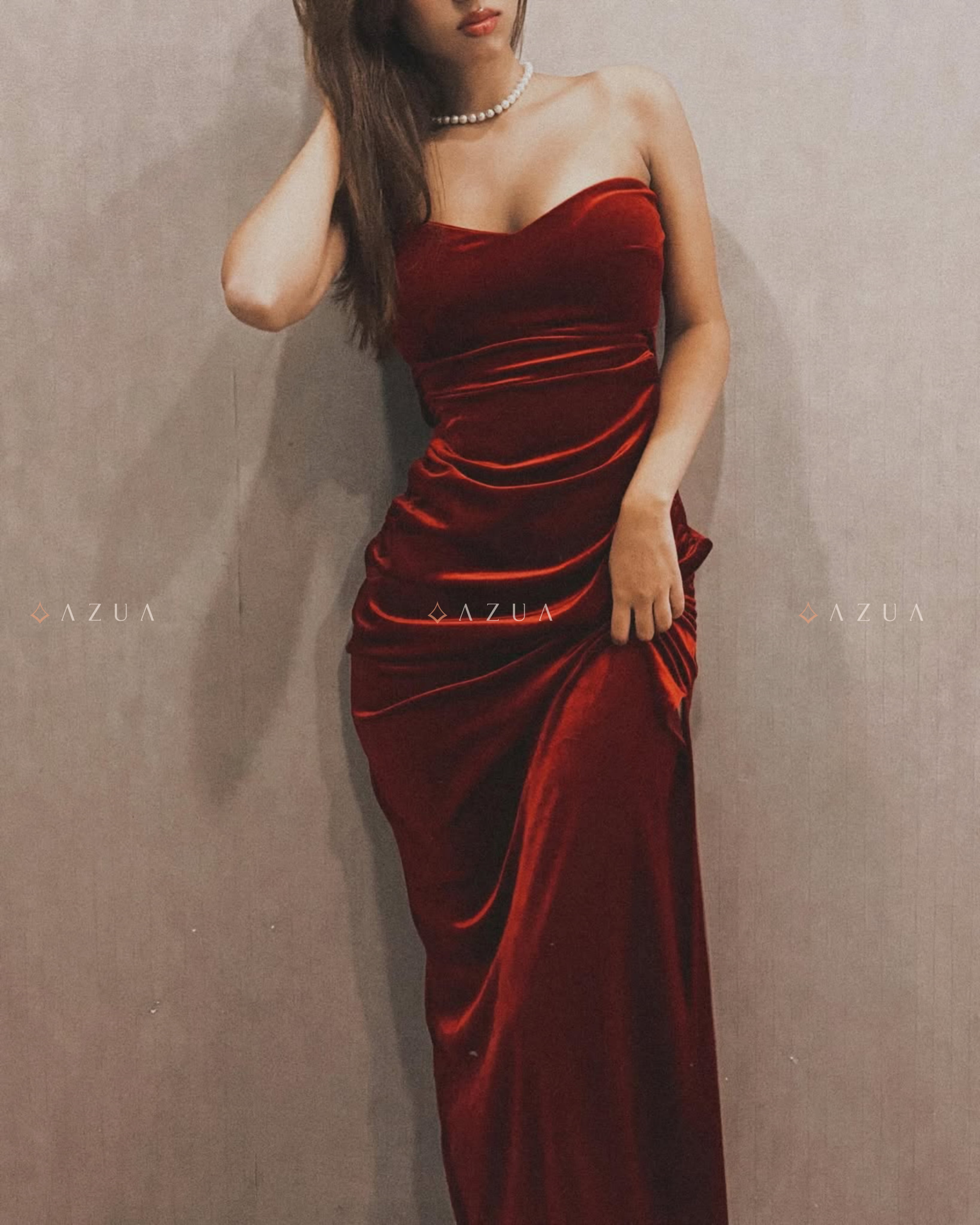 This red strapless bodycon dress is crafted from soft velvet fabric, capturing a refined, elegant charm with a subtle touch of playfulness.