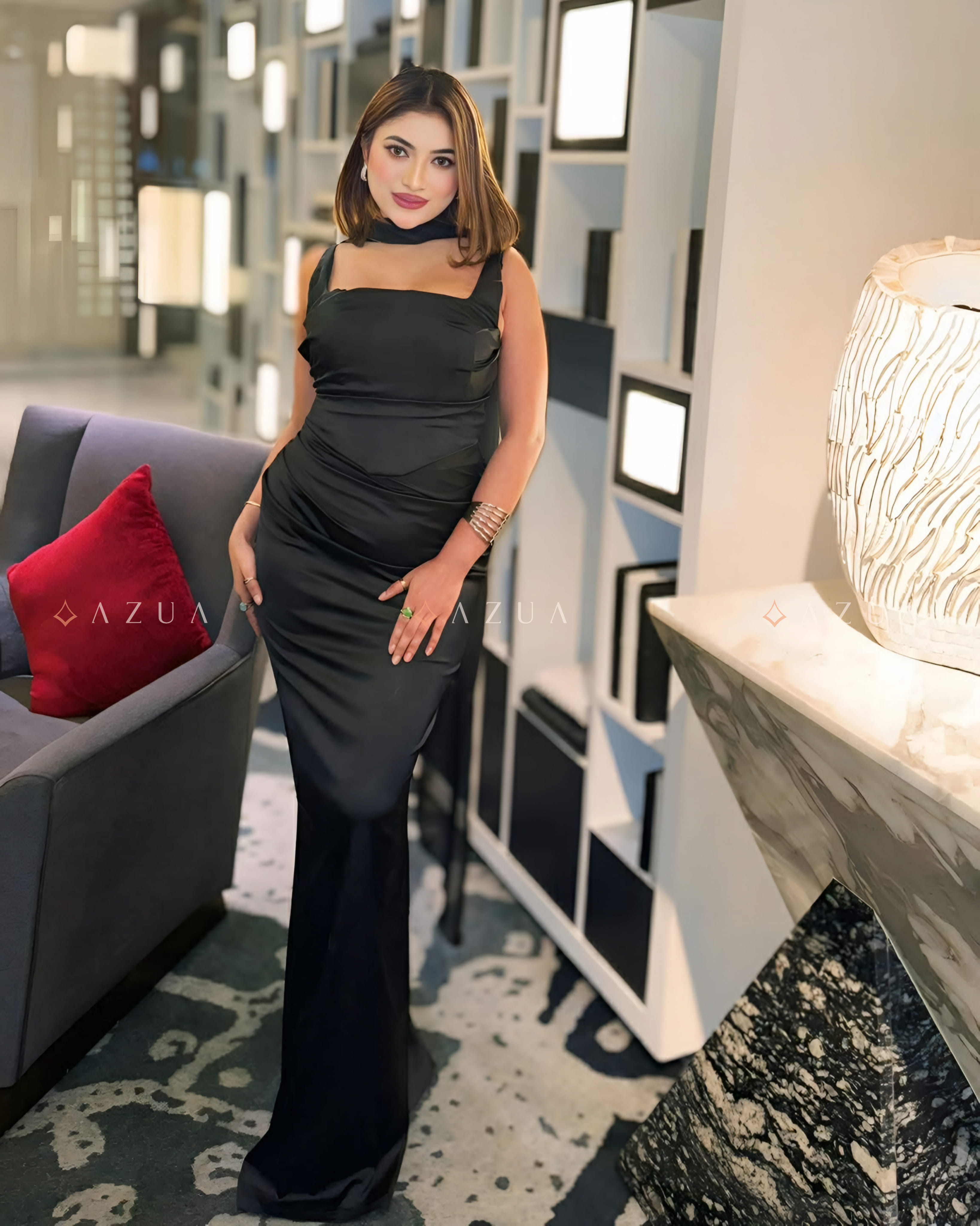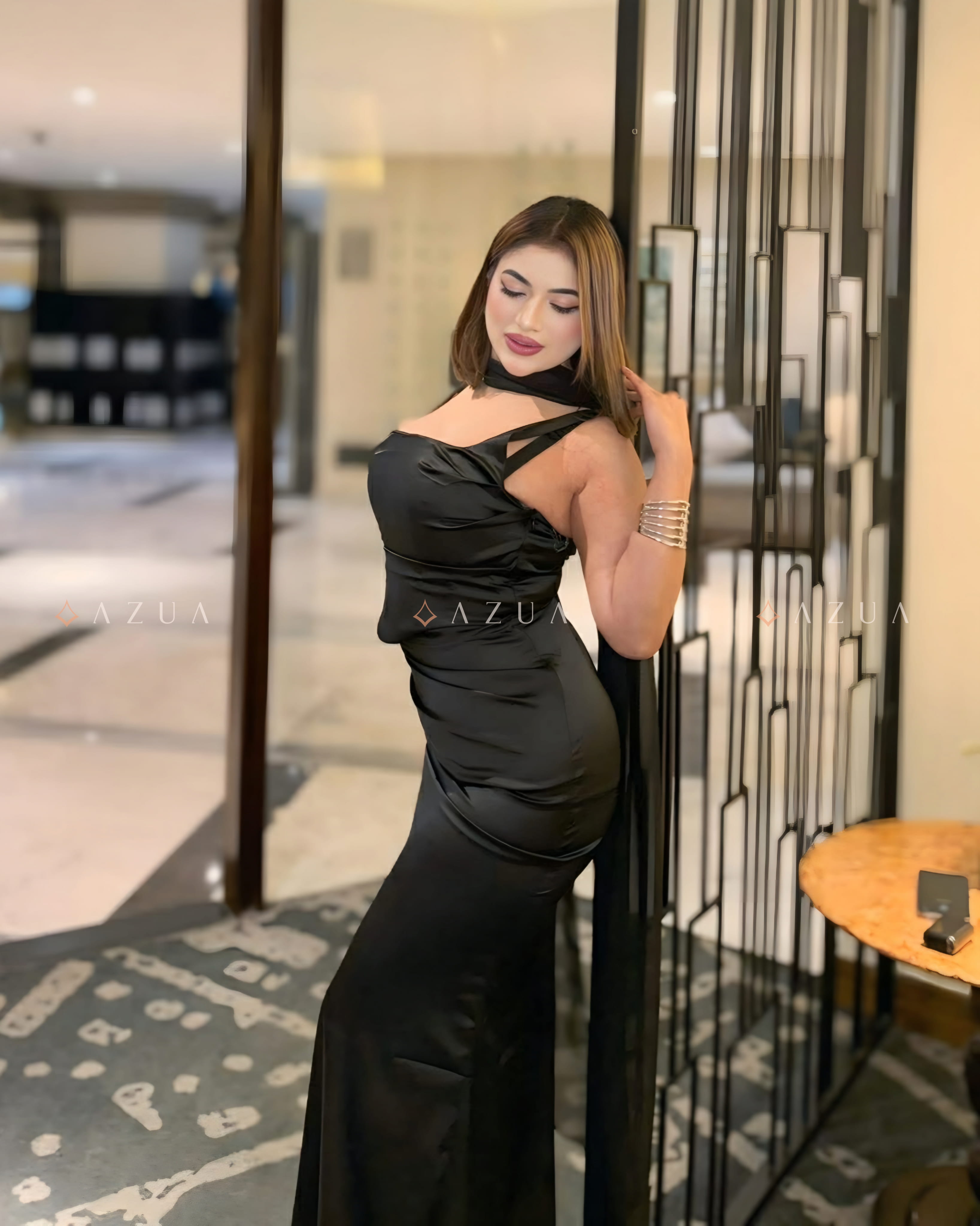 Standing out with its luxurious satin finish and modern silhouette, the Olive Calanthe Maxi Dress embodies refined femininity. The square neckline and softly draped bust create an elegant, graceful look, while the asymmetrical pleated bodice adds a sophisticated edge. Adjustable thin straps and a lace-up back ensure a flattering, customized fit. Perfect for special occasions, elegant dinners, and cocktail events.